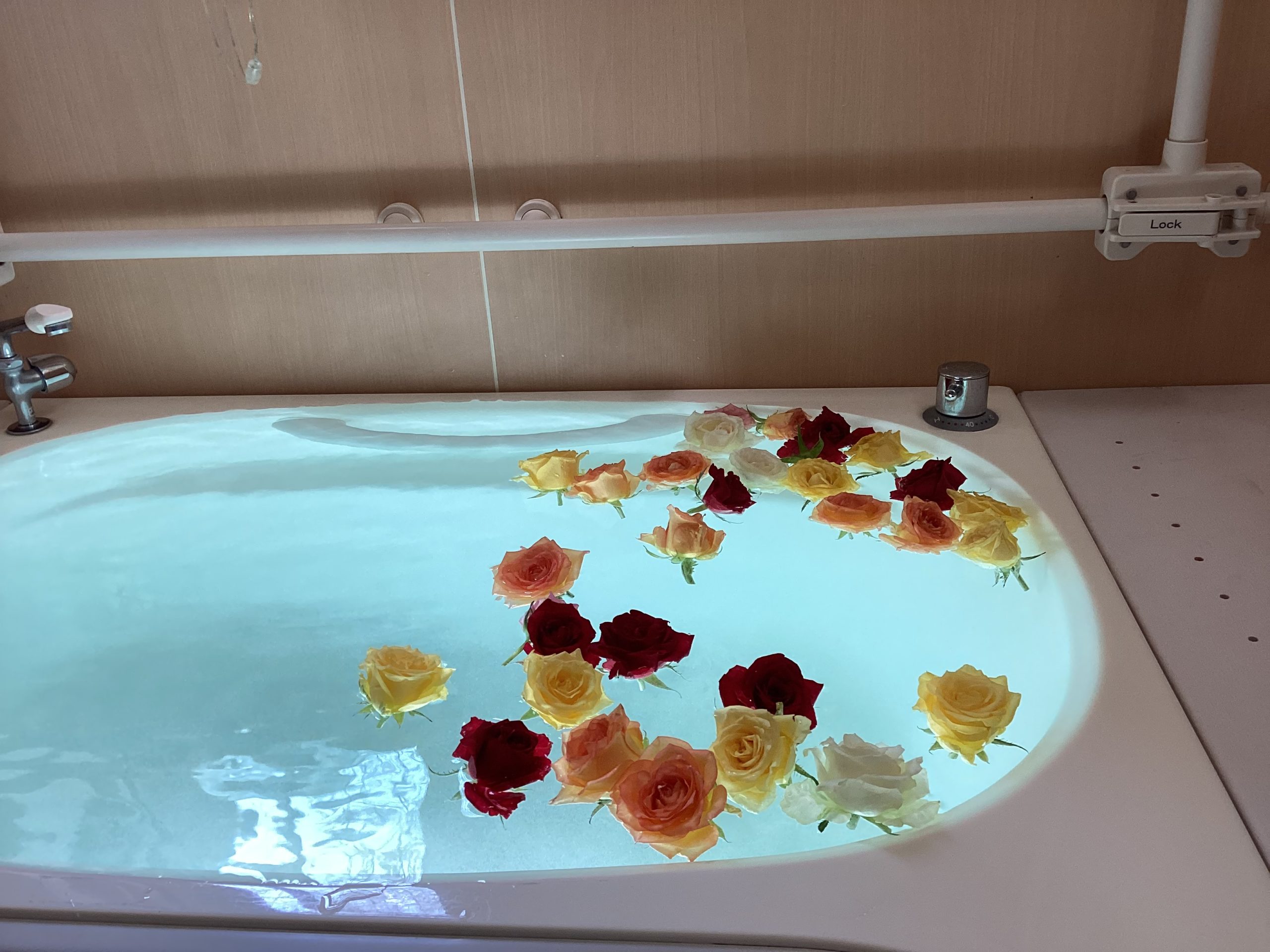有料老人ホームではバラ風呂イベントが毎年恒例になっております。寒河江市からバラを購入し…